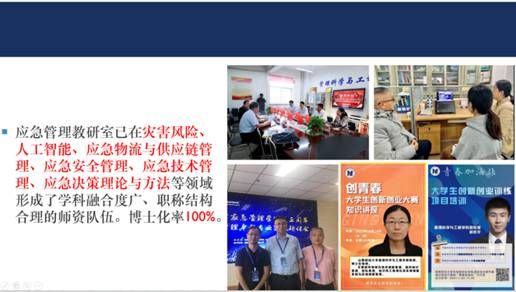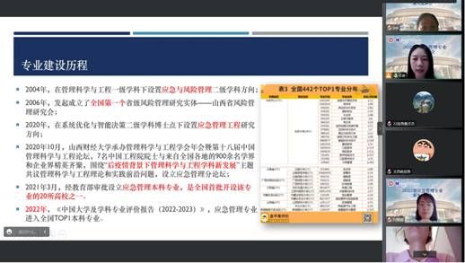 2022年9月20日下午,应急管理专业在云端举办新生导师见面会,应急管理教研室全体教师参加会议,会议由应急管理教研室主任王迪主持。会议第一阶段,王迪老师对我校应急管理专业建设历程重要节点进行介绍。2021年3月,经教育部审批,山西财经大学设立应急管理本科专业,成为全国首批开设该专业的20所高校之一;2022年,根据《中国大学及学科专业评价报告(2022-2023)》,山西财经大学应急管理专业进入全国TOP1本科专业。专业紧密围绕习近平总书记提出的国家安全观的顶层要求,通过合理的课程体系设计,旨在培养拥有高度社会责任感、具备国际视野、创新精神、德智体美劳全面综合发展的高素质应急管理人才。会议第二阶段,由应急管理教研室副主任闫慧丽老师介绍教研室师资力量,应急管理教研室师资力量雄厚,现有教授3人,副教授4人,讲师3人,博士化率100%,已在灾害风险、人工智能、应急物流与供应链管理、应急安全管理、应急技术管理、应急决策理论与方法等领域形成了学科融合度广、职称结构合理的师资队伍,能够有力支撑“本-硕-博”完整的应急管理人才培养体系。同时,在人才培养过程中,专业突出理论教学、实践训练和应急管理规划与设计相融合,在开展应急管理理论教学与科学研究的同时,为学生提供创新创业、学科竞赛指导,以及应急管理大讲堂特色活动,搭建“学科竞赛+科研项目+应急演练”三位一体的个性化育人平台。