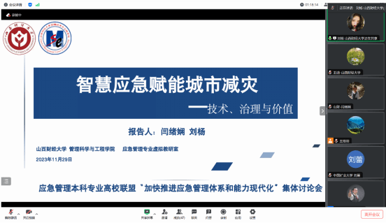 20231129日,由应急管理本科专业高校联盟主办,西北大学公共管理麻将消消乐 (应急管理麻将消消乐 )承办的“加快推进应急管理体系和能力现代化”集体讨论会成功召开,本次会议采用腾讯会议方式,会议报告分为联盟专家组和西北大学研究生组两个部分。山西财经大学麻将消消乐 院长闫绪娴教授、应急管理教研室主任王迪、应急管理教研室教师闫志华作为联盟专家组成员,受邀进行学术报告。
