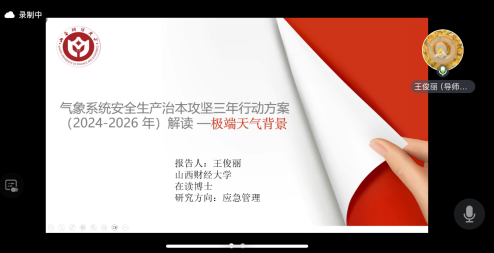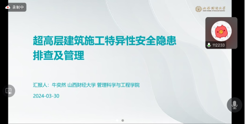 会议第三单元由山西财经大学麻将消消乐 应急管理教研室主任王迪老师主持。山西财经大学麻将消消乐 闫志华博士以《市场监管系统安全生产治本攻坚三年行动方案解读与工业产品质量安全监管》为题,从国家抽检和地方抽检两个角度梳理了我国工业产品质量安全监管现状,随后对市场监管系统安全生产治本攻坚三年行动方案进行解读,指出当前市场监管系统将向着优化质量监管机制模式,健全法规标准体系,加强科技支撑的工作目标发展。山西财经大学麻将消消乐 牛奕然博士以《超高层建筑施工特异性安全隐患排查及管理》为题,从超高层建筑定义与特点出发,指出可采用现场勘查、资料分析、专家咨询等方式事先进行危险源辨识,并基于风险矩阵法、LEC评价法等,结合超高层建筑施工特点,构建风险评估模型,最后可结合PDCA循环持续改进安全管理。山西财经大学麻将消消乐 王俊丽博士以《气象系统安全生产治本攻坚三年行动方案(2024-2026年)解读》为题,系统梳理了2023年国内的十大天气气候事件,随后围绕气象系统安全生产治本攻坚三年行动方案,分别从工作目标、主要任务和保障措施三个部分进行详细解读。山西财经大学麻将消消乐 刘杨博士以《文物系统安全生产治本攻坚:筑牢历史宝库的安全壁垒》为题,以文物系统的安全事故案例为切入点,表明根据文物保护工作的实际情况制定相应的治本攻坚行动方案至关重要,随后通过解读文物系统安全生产治本攻坚的主要任务,指出消防安全仍是文物系统安全生产治本攻坚的重点。山西财经大学麻将消消乐 硕士研究生南世彤以《商务系统安全生产治本攻坚三年行动方案解读-以商铺火灾事故为例》为题,根据商务系统安全生产治本攻坚三年行动方案中的工作目标、主要任务和保障措施三部分进行详细解读,围绕火势控制、实施保障以及监督机制等方面对近期发生的商铺火灾事故进行了具体分析。