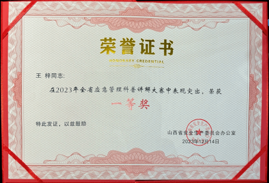 2021级应急管理专业学生王梓经过校内选拔、择优推荐,代表全省教育系统参加了决赛,与山西省安委会有关成员单位、各市安委办和省属重点企业25家单位选派的选手同台竞技,围绕《什么是地震预警》完成自主命题讲解,并在随机命题讲解中,准确完成“彩虹-4无人机”科普讲解,凭借昂扬的精神面貌和扎实的专业技能,最终获得96.75分,斩获2023年山西省应急管理科普讲解大赛一等奖(本次大赛仅设置一等奖一名)。