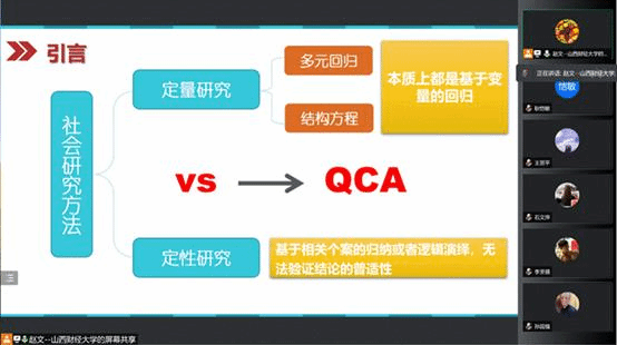 本次研讨会采用线上的方式进行。赵文老师介绍了QCA方法的产生背景,通过国内外相关文献的梳理对QCA方法的应用前景进行了分析。赵老师指出,社会科学领域已经进入复杂性研究的时代,各社会科学领域都开始尝试复杂性理论和QCA方法,我们应抓住这一趋势。接着,赵老师对QCA方法的因果分析、集合关系、布尔代数进行了详细的介绍,使大家更加深入地了解了QCA方法的底层逻辑,对QCA方法有了初步的认识。随后,赵老师结合具体实例就csQCA和fsQCA两种方法的使用步骤以及软件操作进行了详细地介绍,通过对比两种方法使大家对QCA方法的具体应用有了初步了解。最后,赵老师结合发表在《管理世界》上的关于QCA方法的论文《什么决定了政府公共卫生治理绩效?——基于QCA方法的联动效应研究》进行讲解,进一步加深了同学们对QCA方法的印象。