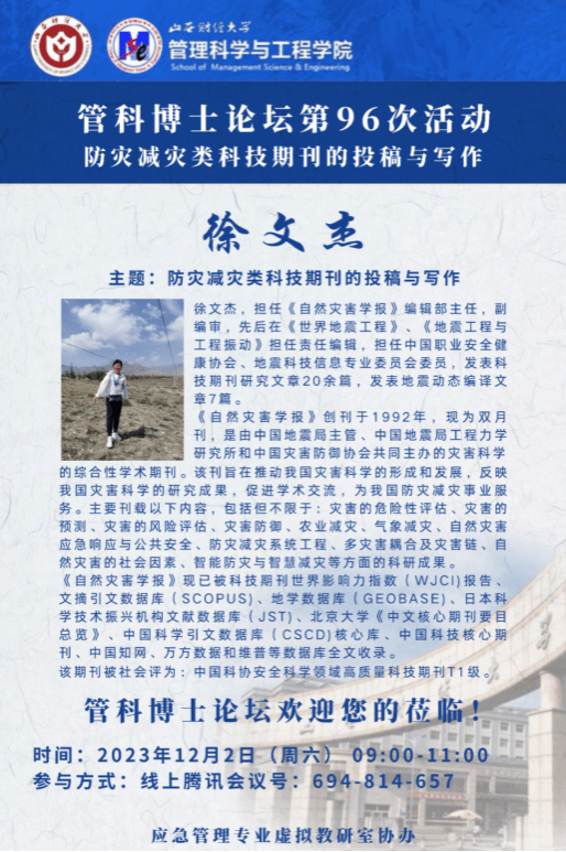 师生开展题为“防灾减灾类科技期刊的投稿与写作”的学术讲座暨第96次管科博士论坛。讲座采用线上形式开展,由麻将消消乐